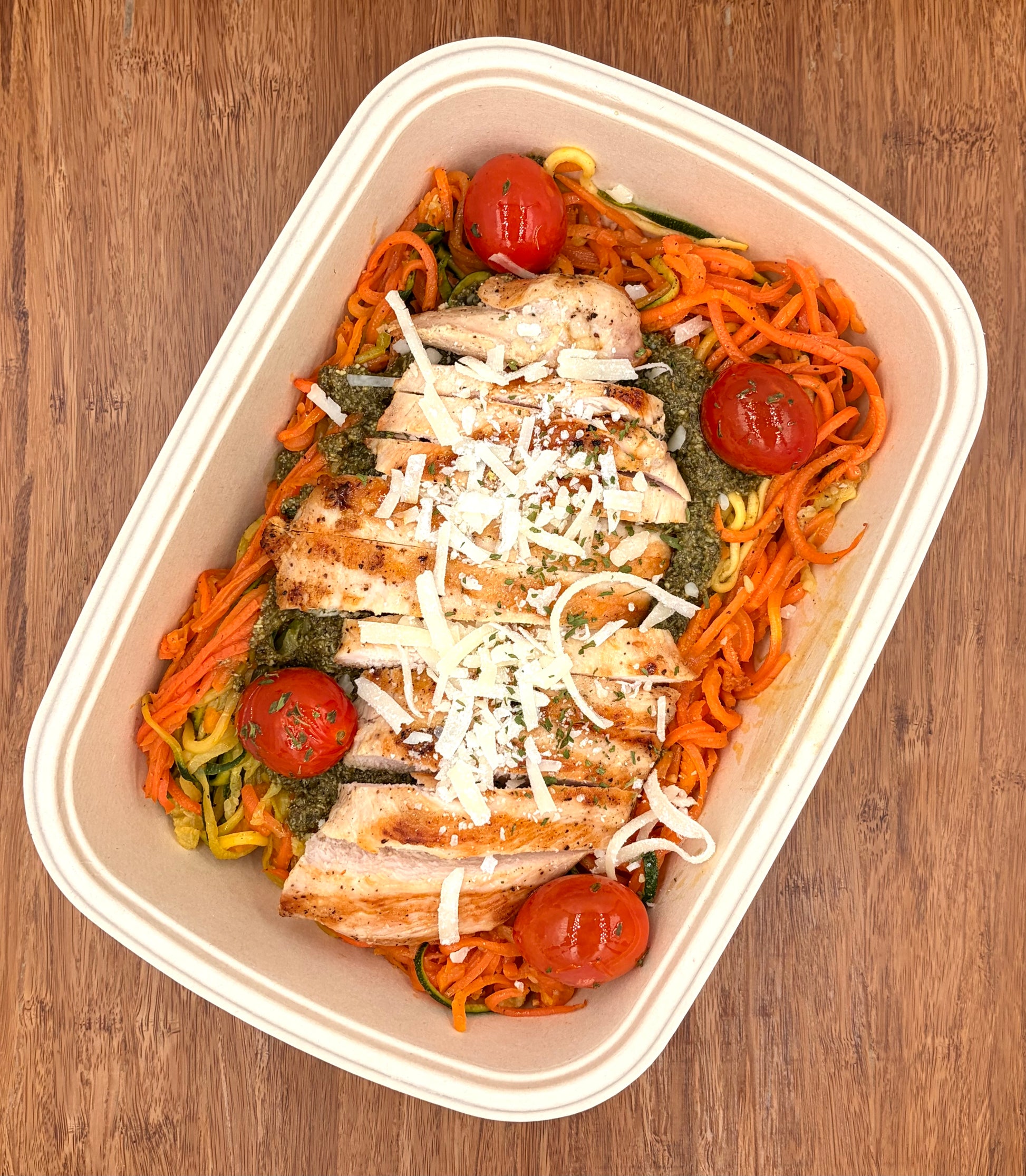 grilled chicken served with penne pasta tossed in aromatic pesto sauce, fresh cherry tomatoes, and finished with shaved Parmesan cheese